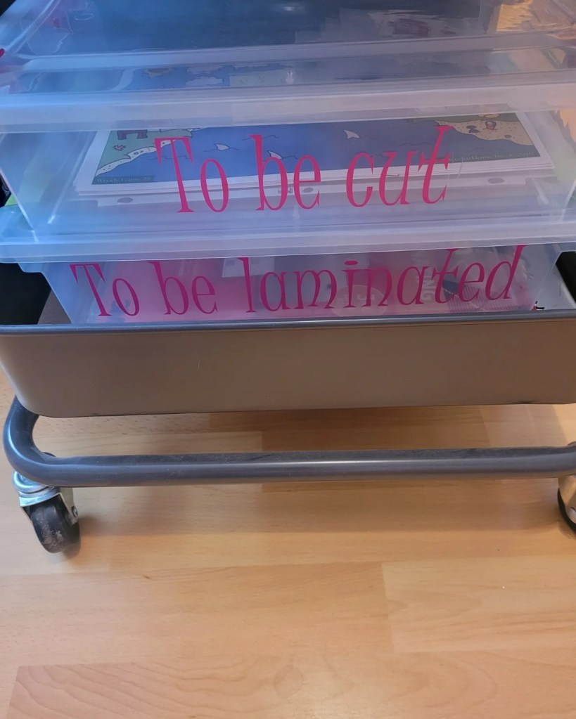 Two of my rolling carts have assorted office supplies in them, and the third cart houses my laminator, laminating sheets, paper cutter, scissors, and bins sorting what needs to be cut and what needs to be labelled.