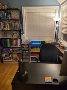 Overall, I feel like organizing my office is something that is never finished. I am always running into situations where I will buy a new toy and start to rethink how I should organize my current toys. My advice to you would be to think about the materials you have and which means of grouping works best for you (e.g., theme, type, use).