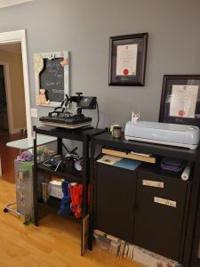 As for my two metal cabinets one is used for storing paperwork and locked client information. The other is for storing my Cricut machine and all the materials. I like these cabinets because they can be locked with a padlock.