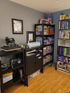 For my two shelving units, I use one for storing board games, bins, and storage boxes. My bins are sorted again into type of toys (e.g., marble set, assorted block toys, games without boxes, extra toys). My second shelf is where I have my heat press which is mostly unrelated but I have made SLP shirts before!