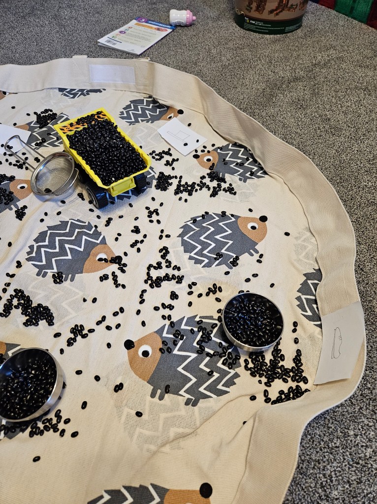 Sensory bins are fun for everyone. Rice is common but can be quite messy! I prefer using beans, pasta noodles, and various pompoms to make most of my sensory bins. They are fun to play with on their own but you can also hide things in them or add tools and toys to scoop, dump and move the material. Note: Water beads that grow are another common sensory bin item but they should be used with caution as many have been found to cause damage if swallowed and can also be choking hazard. I have seen that an alternative to water beads is Tapioca Pearls but I have yet to try them.