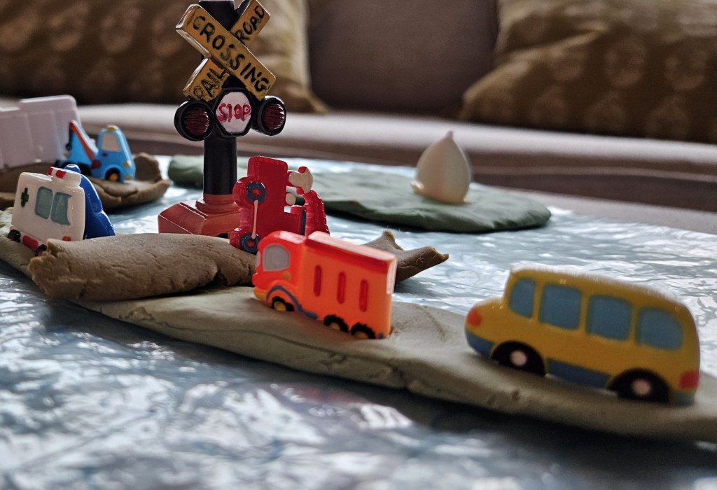 Playdough has so many sets to choose from but even just a container of playdough can lead to a lot of fun. Below, we used playdough to make a road and speedbumps for our cars. Squishing playdough also provides great sensory input.